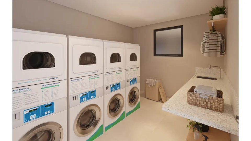 Infraestrutura para Lavanderia Compartilhada: um espaço completo para você cuidar das suas roupas. Lave ou seque suas roupas de forma prática, rápida e econômica dentro do condomínio.