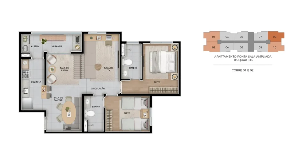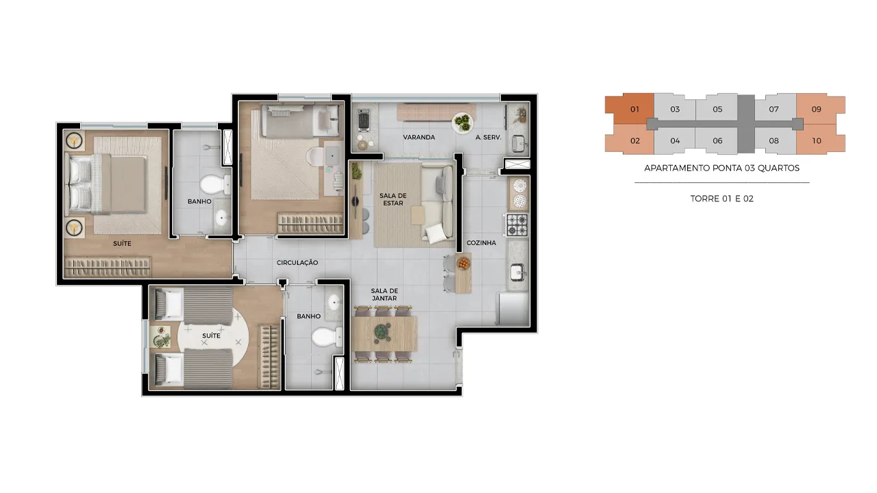 Tipo 3 dorms com suíte e varanda gourmet | 66,82m²